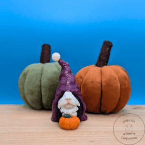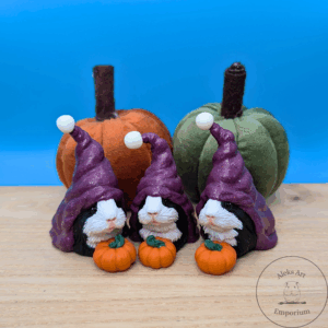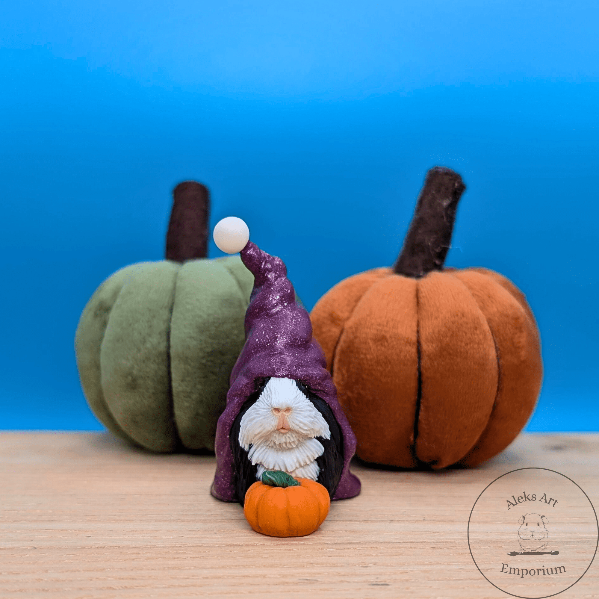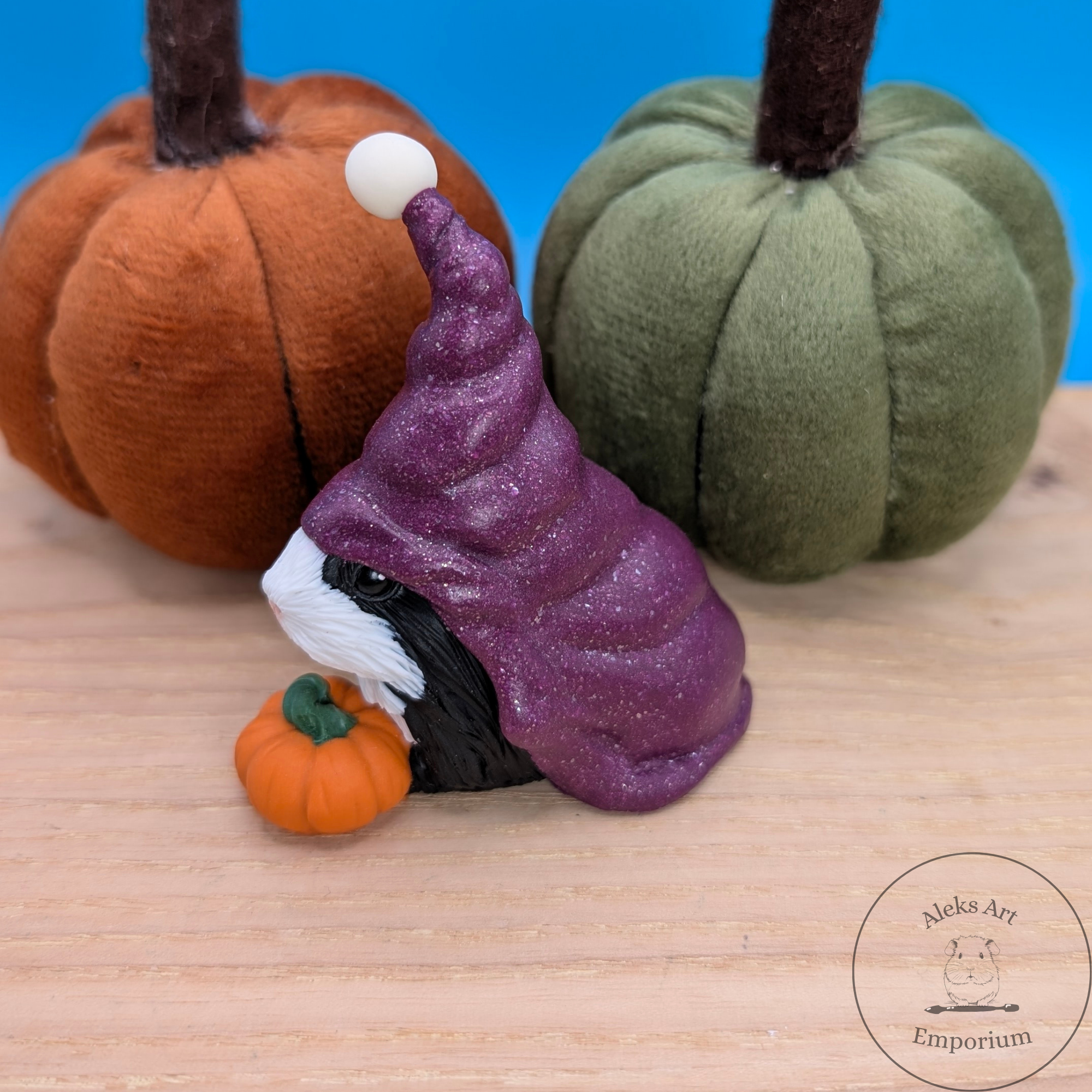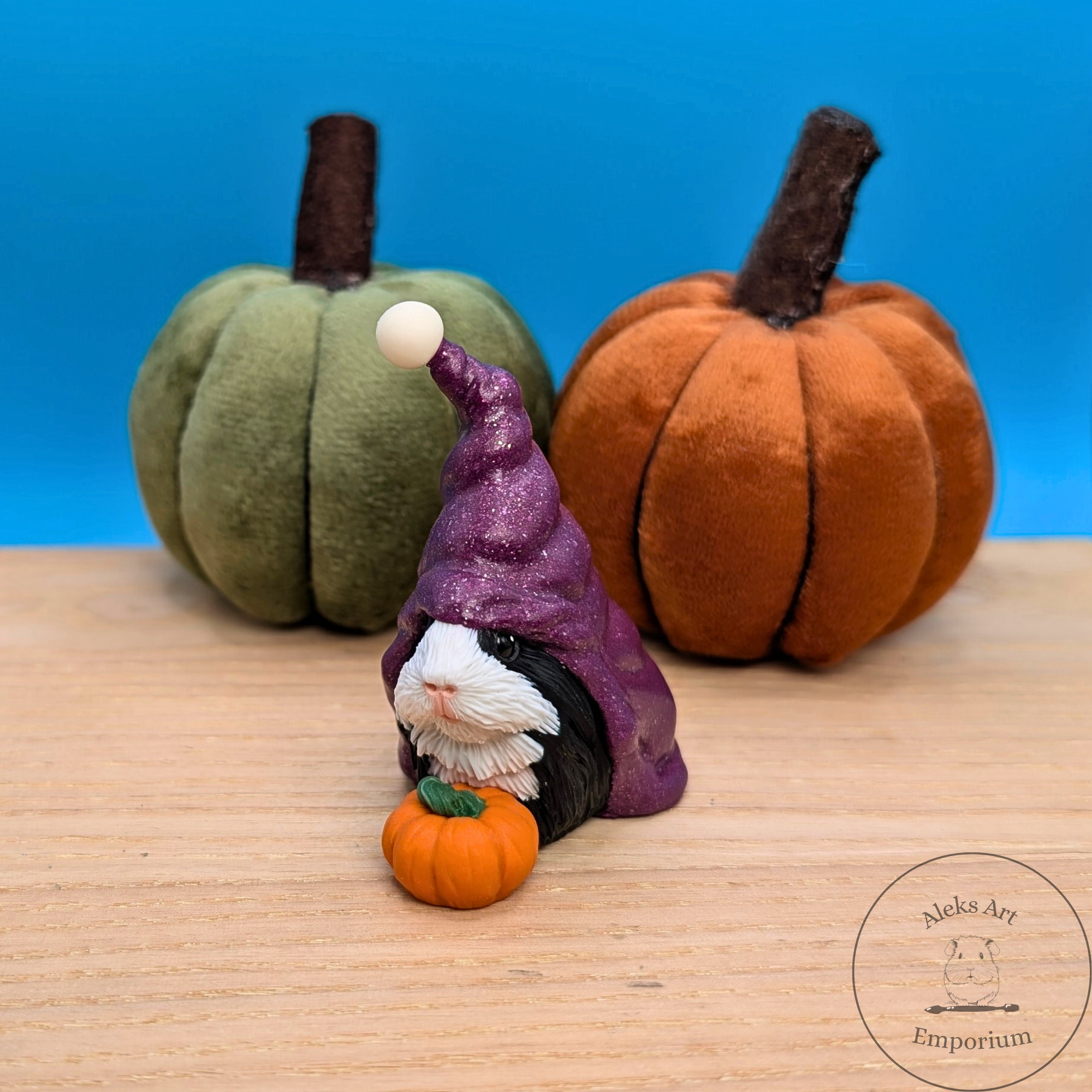 This charming little guinea pig has dressed up gonk-style, complete with a glittery purple hat and a tiny pumpkin at its paws. Inspired by the charm of Scandinavian gonks and the cuteness of guinea pigs, this handmade piece is full of character and guaranteed to make you smile!