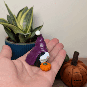 - Features a sparkly purple gonk hat and miniature pumpkin