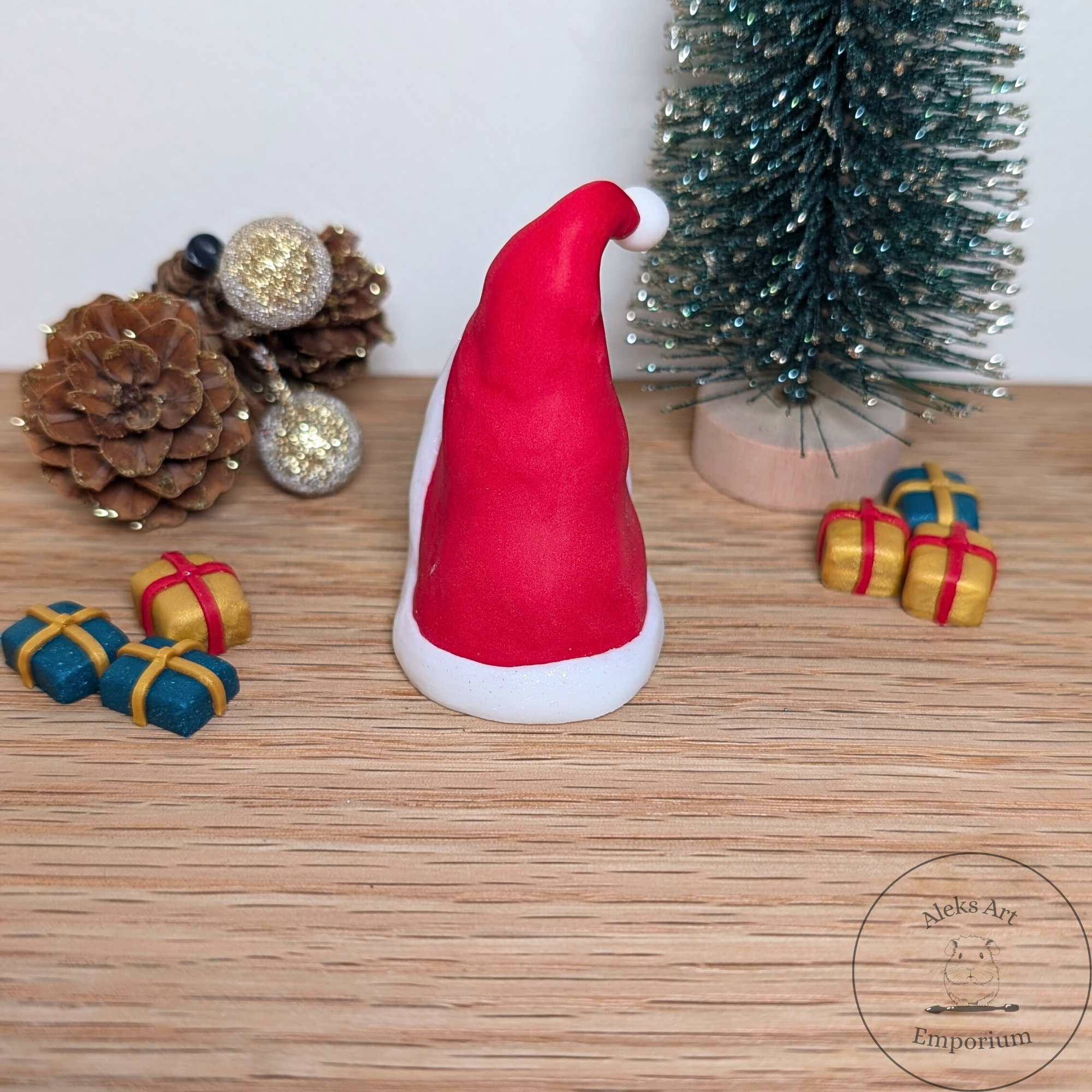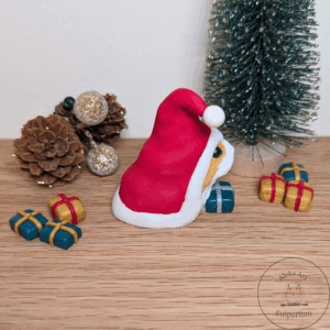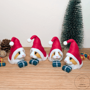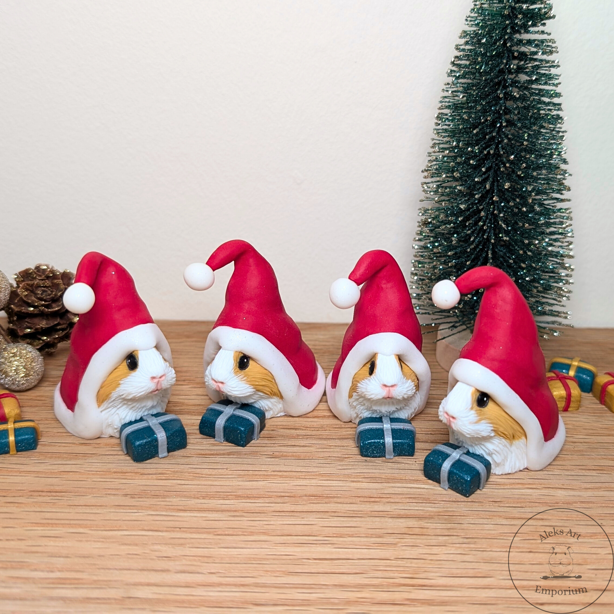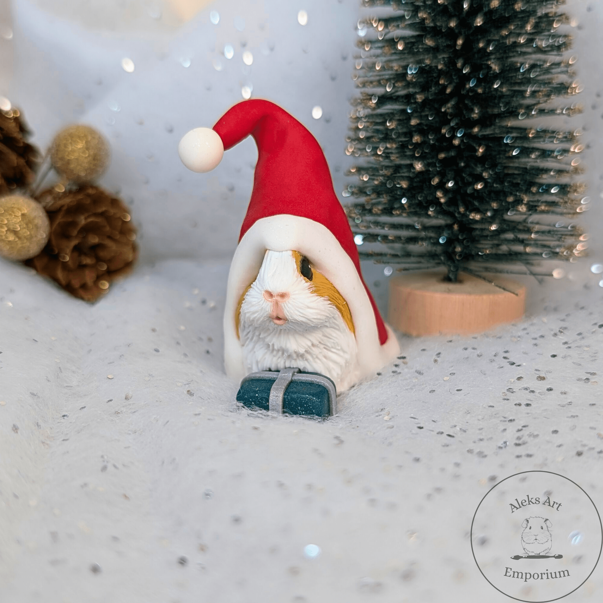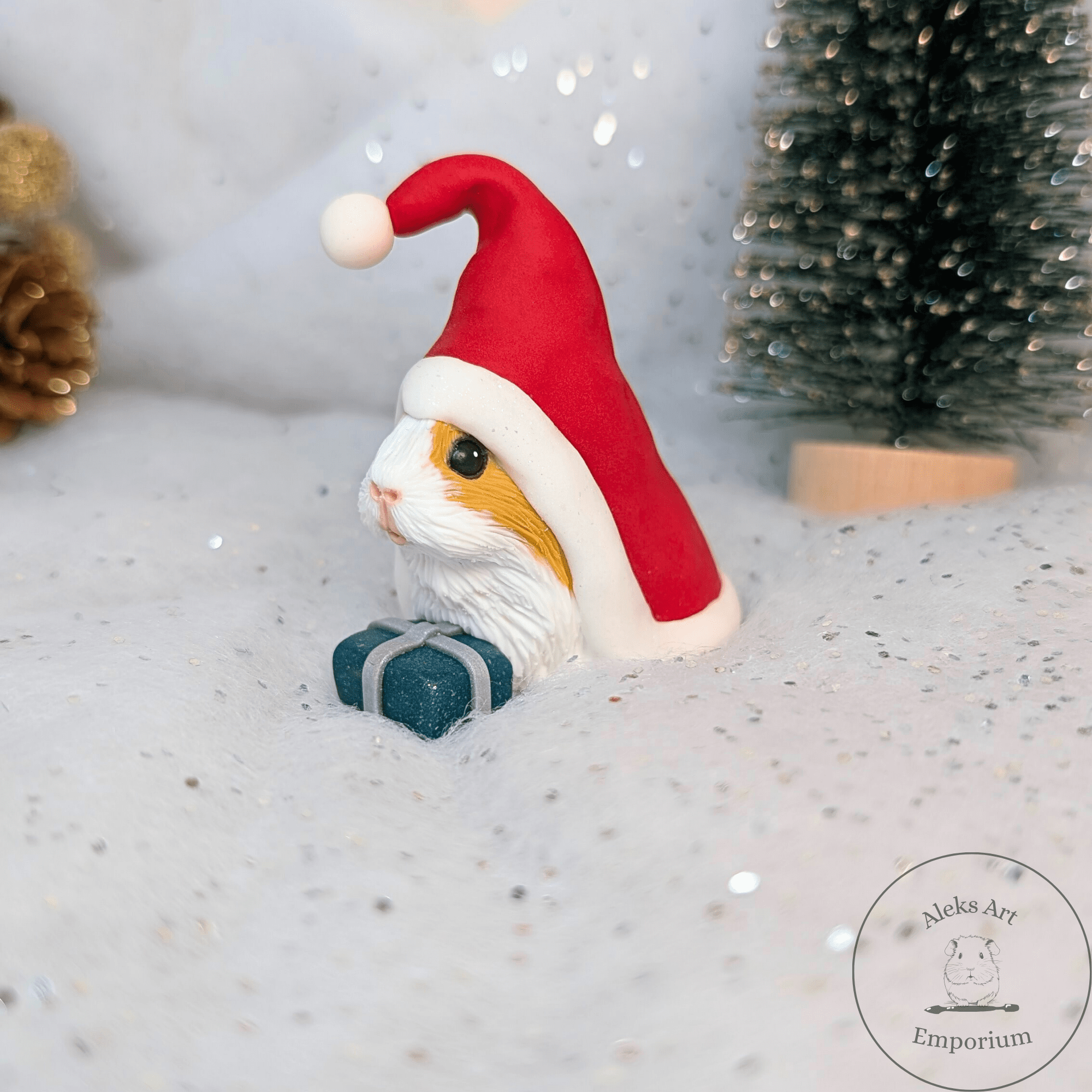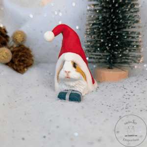 Lovingly sculpted in polymer clay, this little guinea pig is all dressed up for the holidays in a cosy red Santa hat and holding a tiny wrapped present — ready to spread joy straight from under the tree. Every detail, from the soft folds of the hat to the expressive little face, has been carefully handcrafted to capture the charm and warmth of the season.