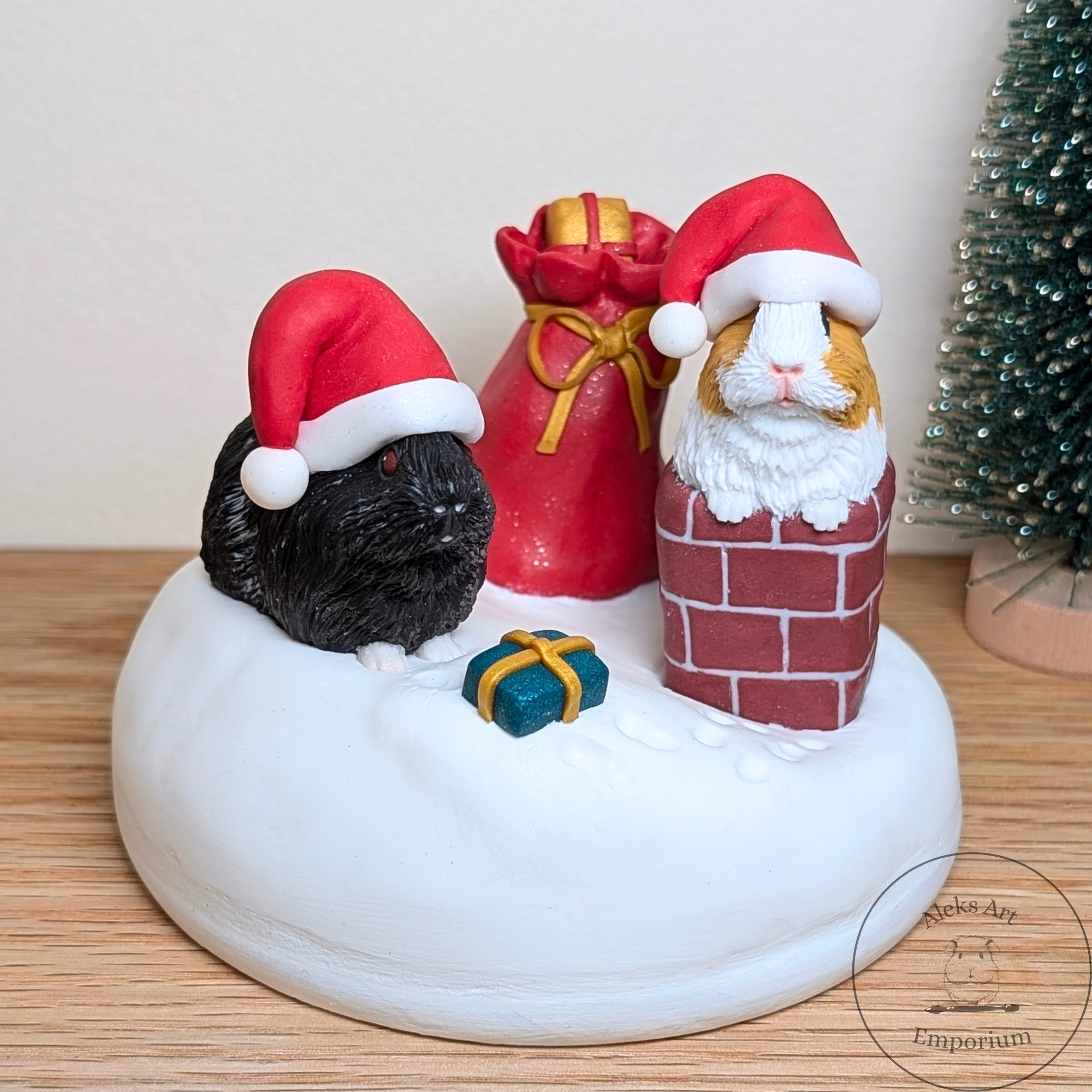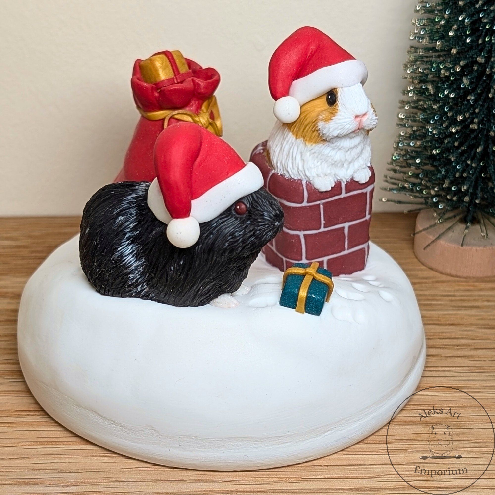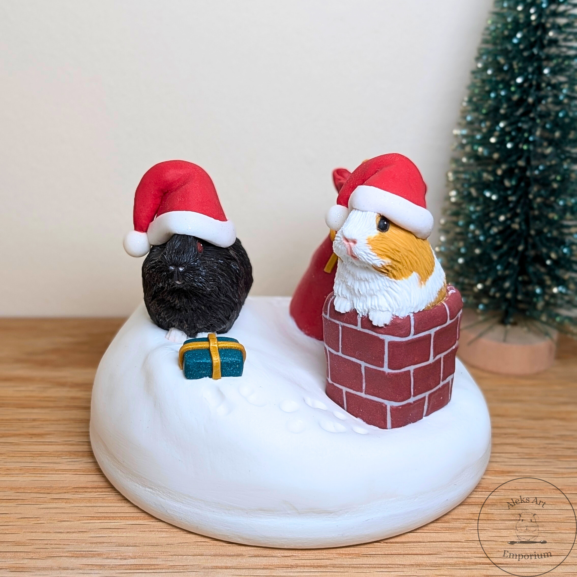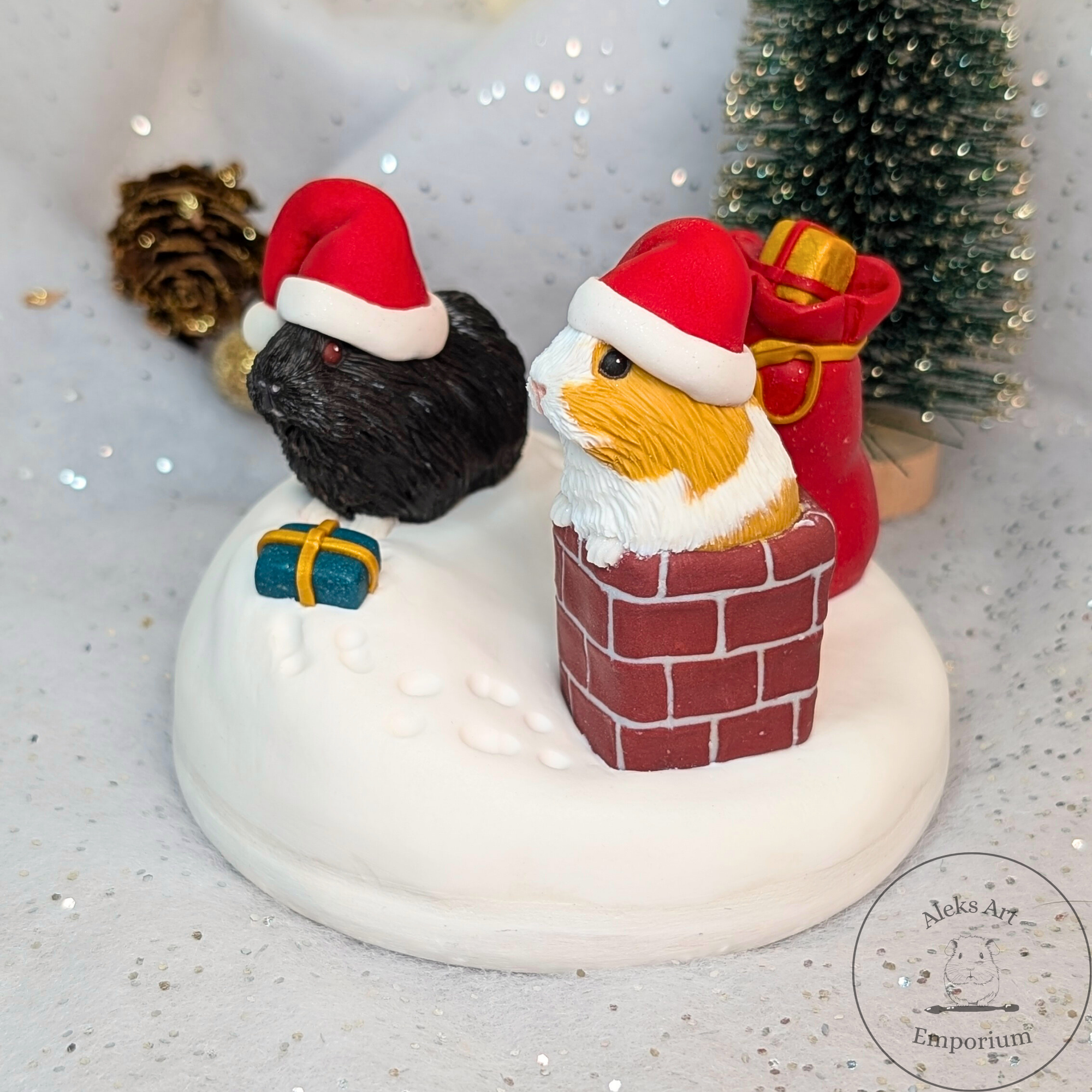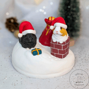 This festive sculpture celebrates the magic of Pigmas through a heartwarming scene featuring my dear guinea pigs, Ozzie and Juniper. Hand-sculpted from polymer clay and set on a wooden base, it captures them mid-adventure on a snowy rooftop — Ozzie passing presents from his gift sack while Juniper wriggles adorably in the chimney, doing her best to deliver the Pigmas cheer!