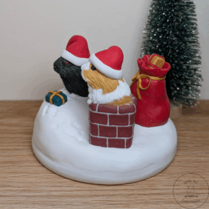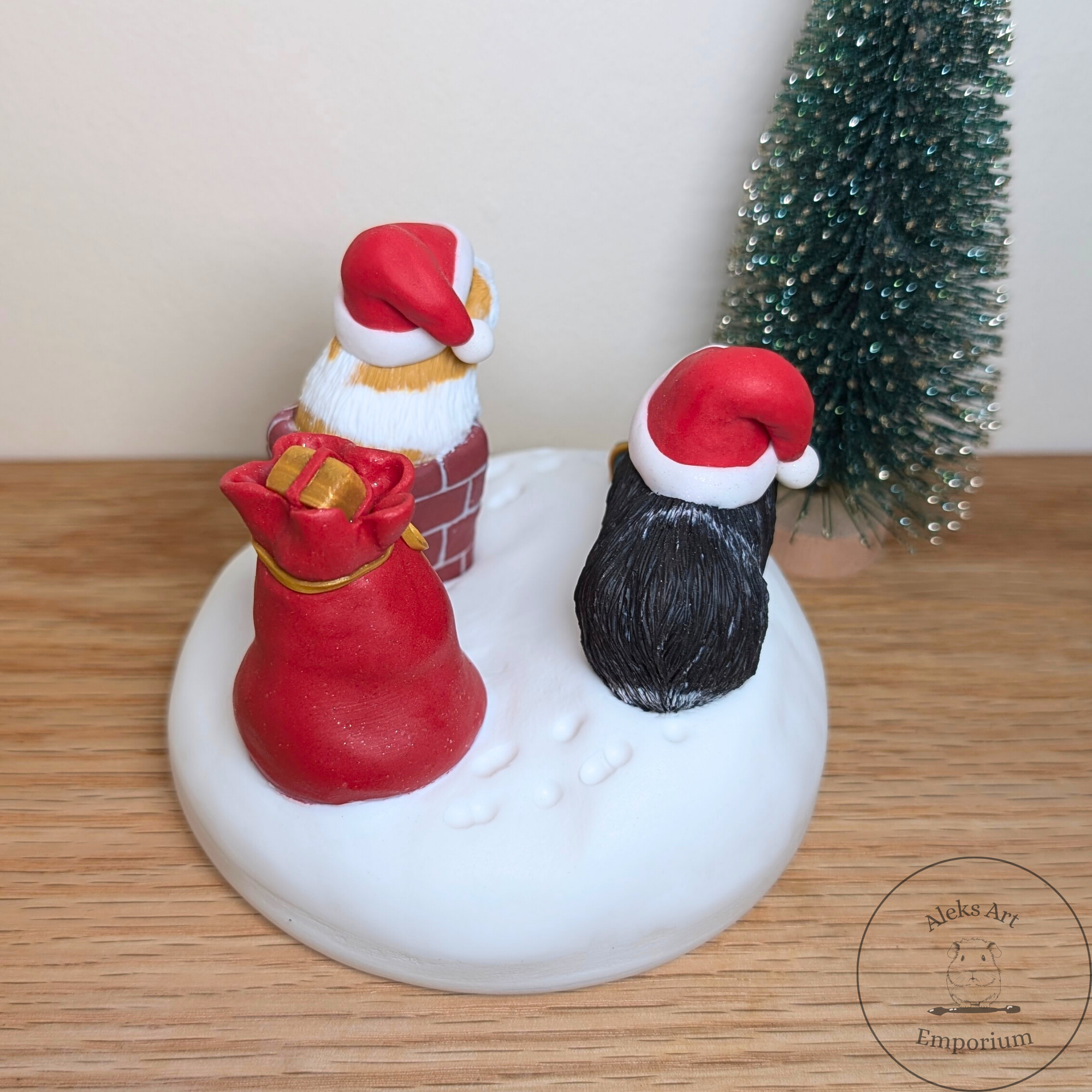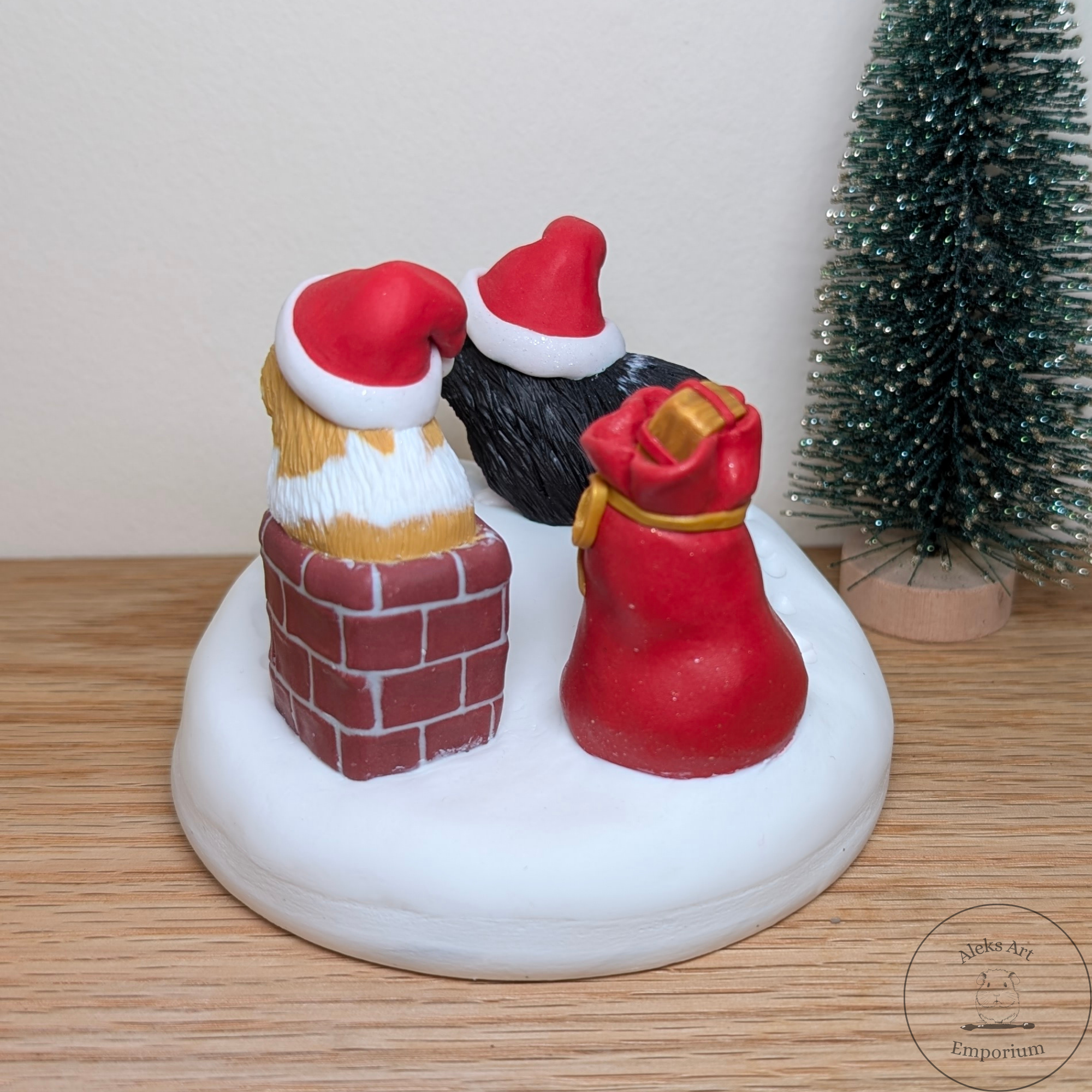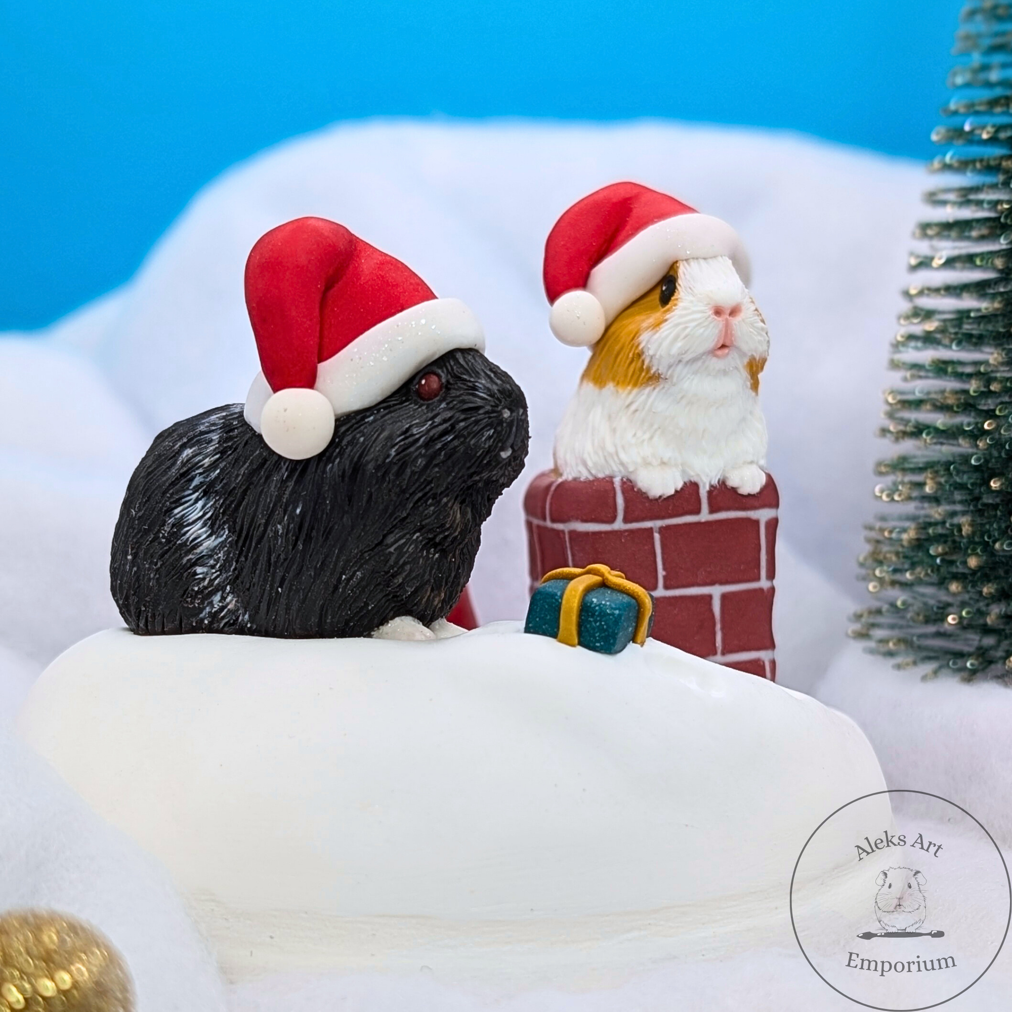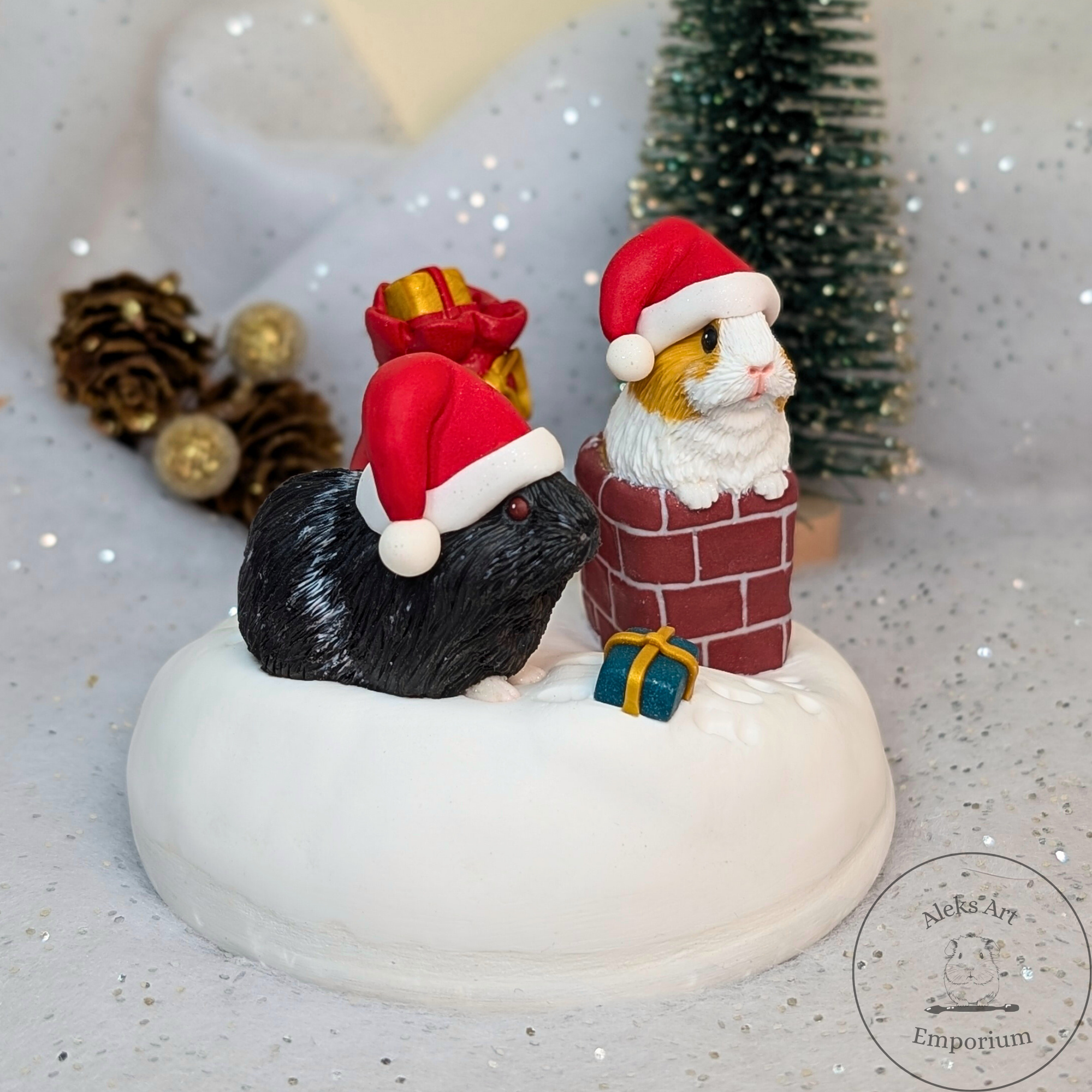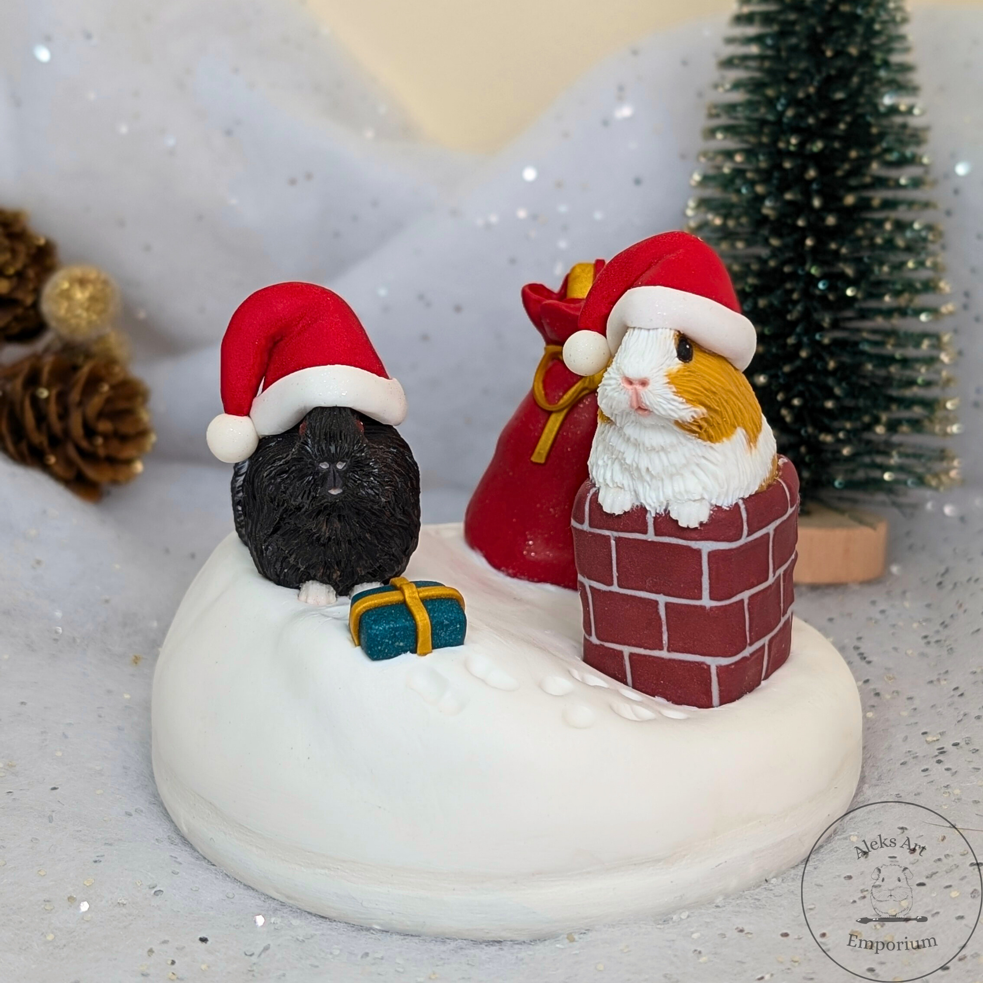 This festive sculpture celebrates the magic of Pigmas through a heartwarming scene featuring my dear guinea pigs, Ozzie and Juniper. Hand-sculpted from polymer clay and set on a wooden base, it captures them mid-adventure on a snowy rooftop — Ozzie passing presents from his gift sack while Juniper wriggles adorably in the chimney, doing her best to deliver the Pigmas cheer!